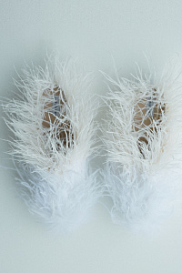 Внутреннюю поверхность лодочек из льна с короткой бахромой согревает натуральная овчина, а носок мюлей без каблука покрывает прозрачная пленка, под которой скрывается пэчворк из кусочков натурального разноцветного мха. Лодочки сливочного оттенка выполнены из сваренного вручную хлопка, одного из “фирменных” материалов Gapanovich, а пышные алые рюши мюлей на каблучке kitten heel — из нежной полупрозрачной ткани из крапивы.