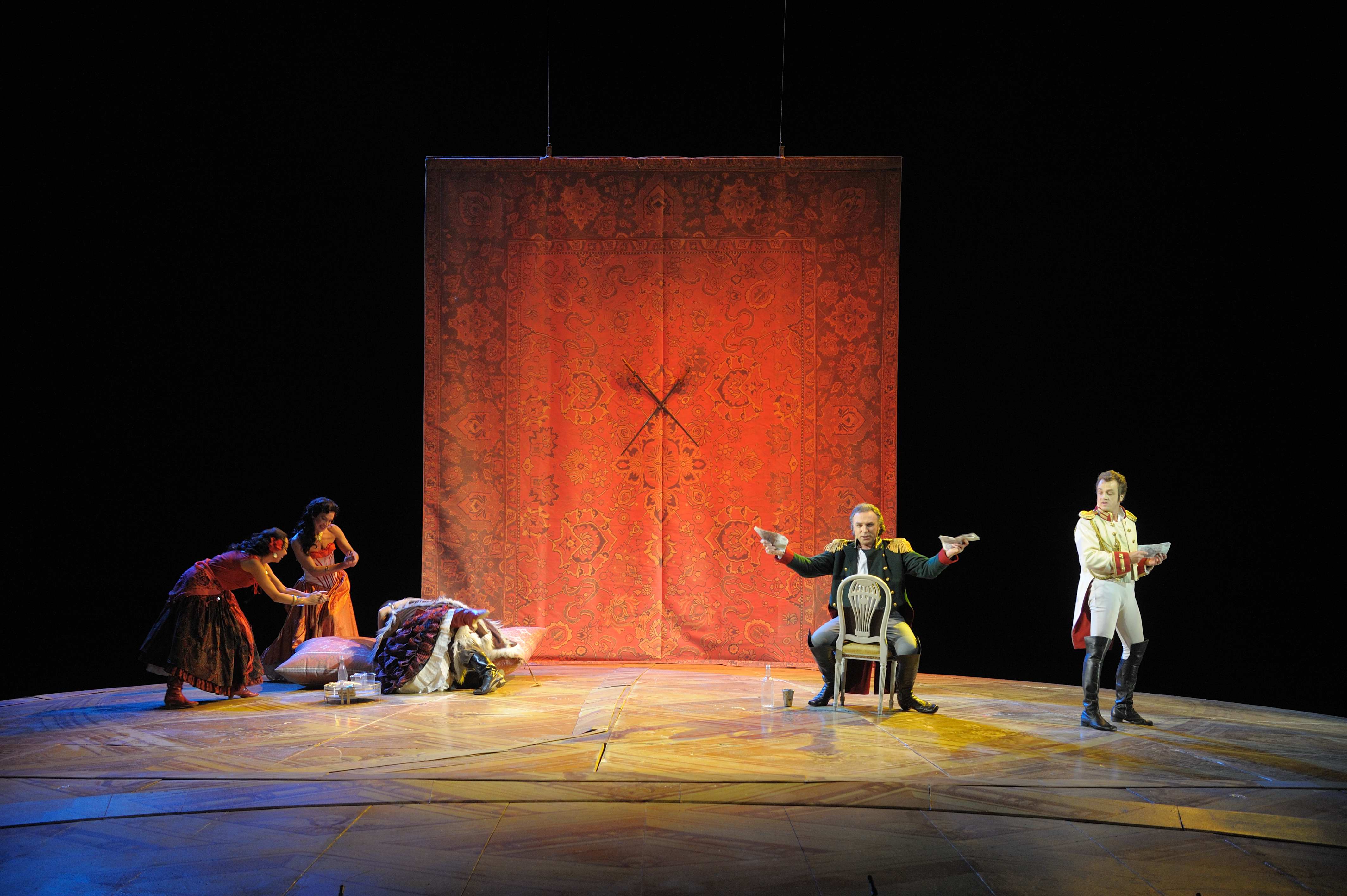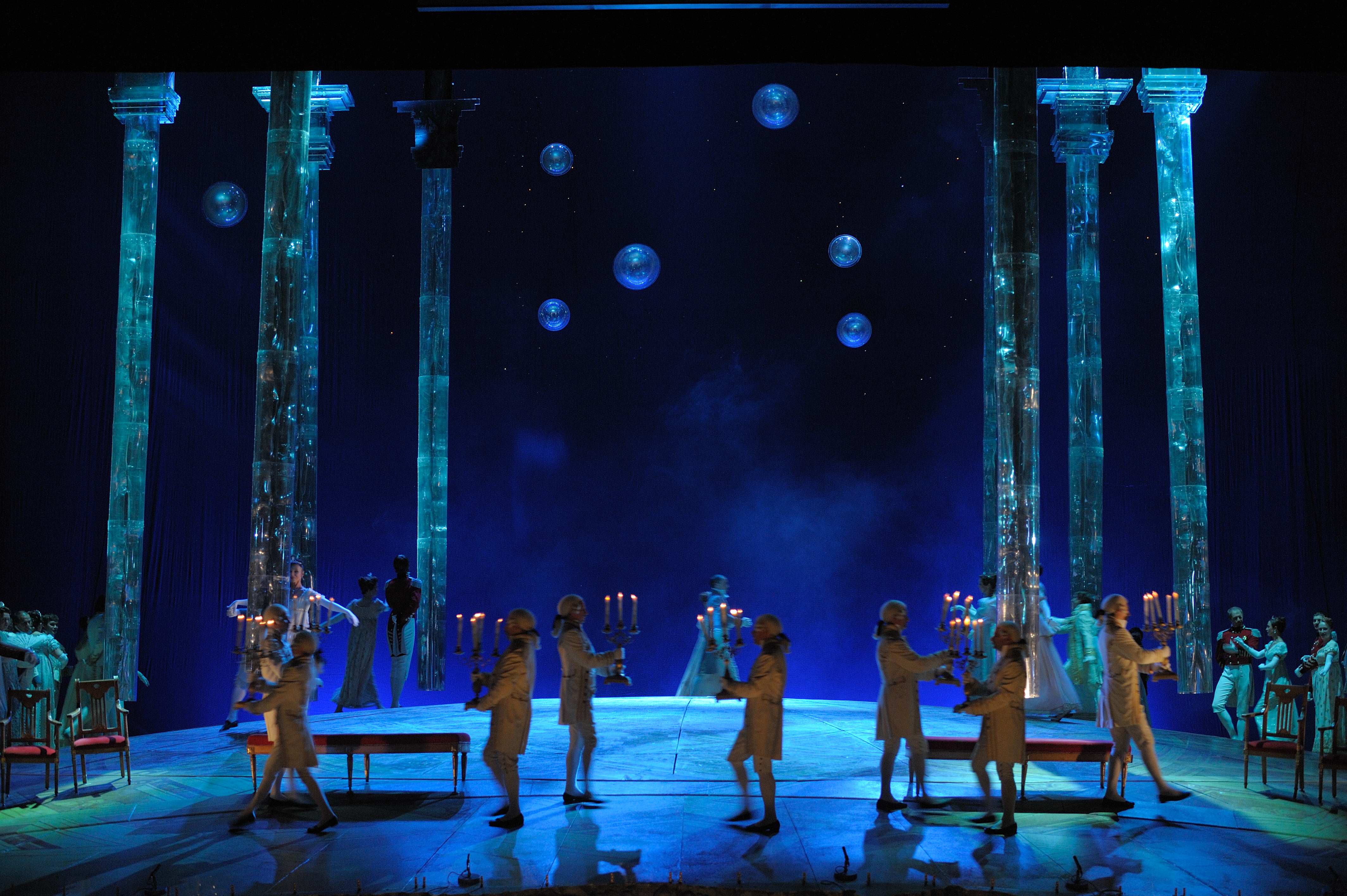 “Эта опера написана по роману гигантскому, написана как киносценарий: эпизоды меняются друг за другом так быстро, что статическая оперная традиция затянула бы эту оперу на лишних два часа. Мне нужно было создать текучесть действия, его трансформацию из одной декорации в другую, происходящую на глазах у зрителей и незаметную для него. Нужно было создать архитектуру пространства. Земля и небо — вот две сферы, первичных для человека. Они и существуют в моей постановке этой оперы как ее идея”, — рассказывал режиссер-постановщик Андрей Кончаловский.